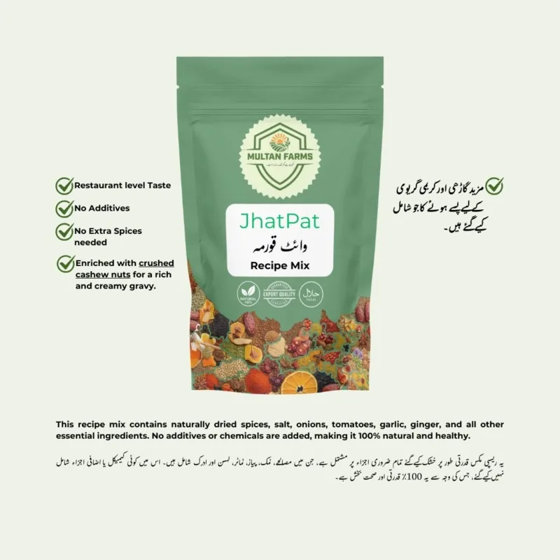 MULTAN FARM’s JhatPat White Korma Recipe Mix is a rich and aromatic spice blend that brings the royal taste of traditional Korma to your kitchen.